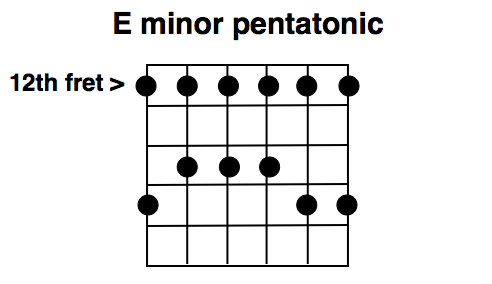 Here’s the simplest way to look at this trick. I’ll do it in the key of E, the same key as the Jimmy Page solo we just listened to. Start with the E minor pentatonic scale in the 12th position–you probably know this one already. That’s the scale position for a ton of classic blues/rock licks a la Clapton, Hendrix, etc. A lot of people call it the “pentatonic box” because of the symmetrical shape it forms on the neck.
