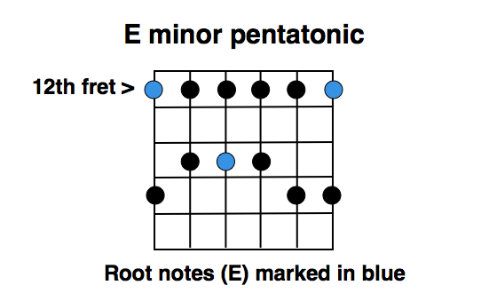 Going back up to the minor pentatonic fingering in the 12th position for a minute, let’s take a look at where the root notes fall. We’re in the key of E, so our root note is E. Of course there’s a root note right at the bottom of the scale on the 6th string, 12th fret. And then as always you have the same note two octaves higher on the 1st string, 12th fret. There’s another E in between those, on the 4th string, 14th fret.