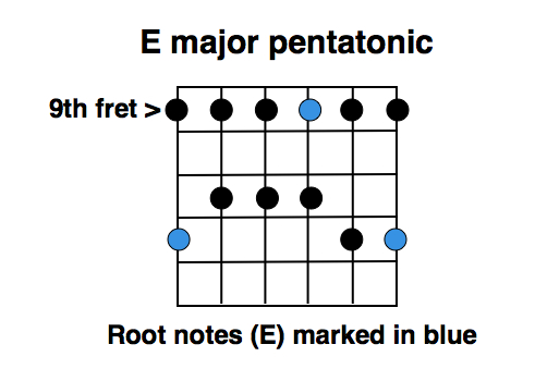 Now let’s drop back down to the major pentatonic fingering, in the 9th position. Notice, now, that the root notes–the E notes–fall in a different place within the fingering. The 12th fret E notes (1st & 6th strings) are now under your pinky, and the other E is on the 3rd string 9th fret, under your index finger. This of course has an impact on how your licks are arranged, if you’re trying to end your licks on a root note.
