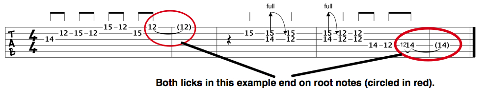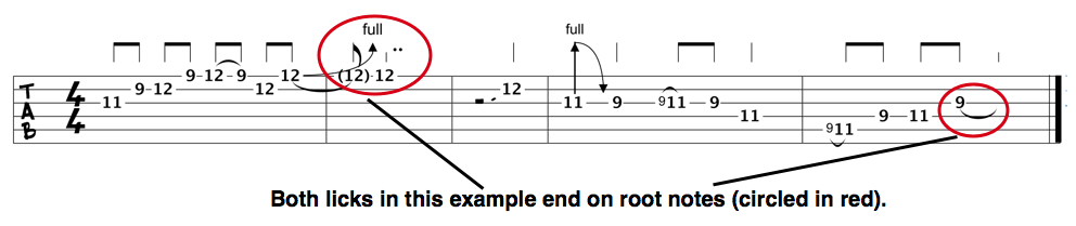 Both of the major pentatonic licks in the above also ended on root notes. Here’s the tab: