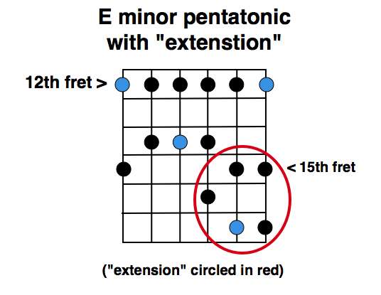 Now let’s go a step further with these pentatonic scales. For starters let’s go back to the minor pentatonic in the 12th position. Just above this fingering is another cluster of notes, in the 15th position, that’s also very useful for a ton of great rock and blues licks. Let’s call this the “pentatonic extension”. Sometimes I also call this the “power house” because of the “house” shape it makes on the fretboard. If the “pentatonic box” described above accounts for 50% of all blues licks ever played, this “house” probably accounts for another 30-40%.