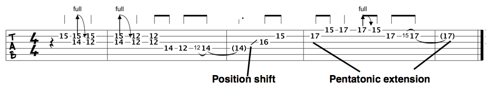 A lot of the time I’ll get into this position by sliding up on the third string with my middle finger, from the 14th fret up to the 16th, which then sets me up perfectly to play off of this shape, with my index finger on the 15th fret.