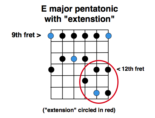 OK, now let’s drop down to the major pentatonic fingering, back in the 9th position. The same “pentatonic extension” that we just discussed also works off of this fingering. If you jump up to the extension, you land in the 12th position–where it also happens to overlap with the minor pentatonic fingering.