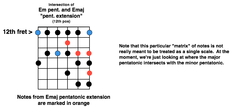 Now let’s look at the 12th position a little more closely. Because the “minor pentatonic box” is so familiar to most of us, we are going to use that as our framework. But now we are going to look at the notes from the major pentatonic that fall in this same position, in addition to the box. The root notes (E) and the 5th (B) occur in both scales. But the major pentatonic does bring in a few notes that are not in the minor pentatonic. The diagram below shows where those notes fall on the upper strings (major pent. notes are marked in orange).