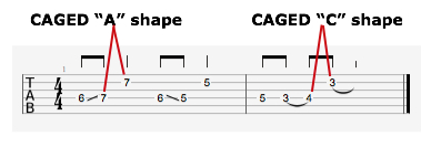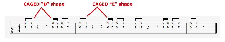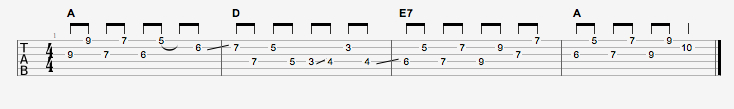 Because these 6ths cover a large portion of the neck, it becomes fairly easy to follow chord progressions by connecting them where it’s convenient. The following lick uses 6ths based on the patterns we saw above, following them through a progression with an A, D, and E7 chord, returning back to A: