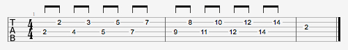 And here’s the A mixolydian scale played on the 2nd & 4th strings: