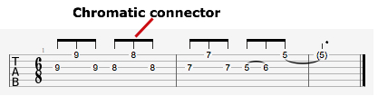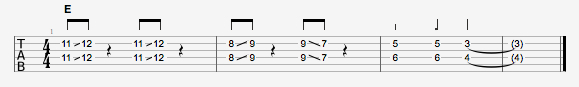 If you’ve played some blues, you will probably recognize this lick–it (or something like it) is often used as a turnaround in a 12-bar blues progression. With a chromatic connection between two of the intervals, this one has a bluesier sound. Again we’re in the key of A.